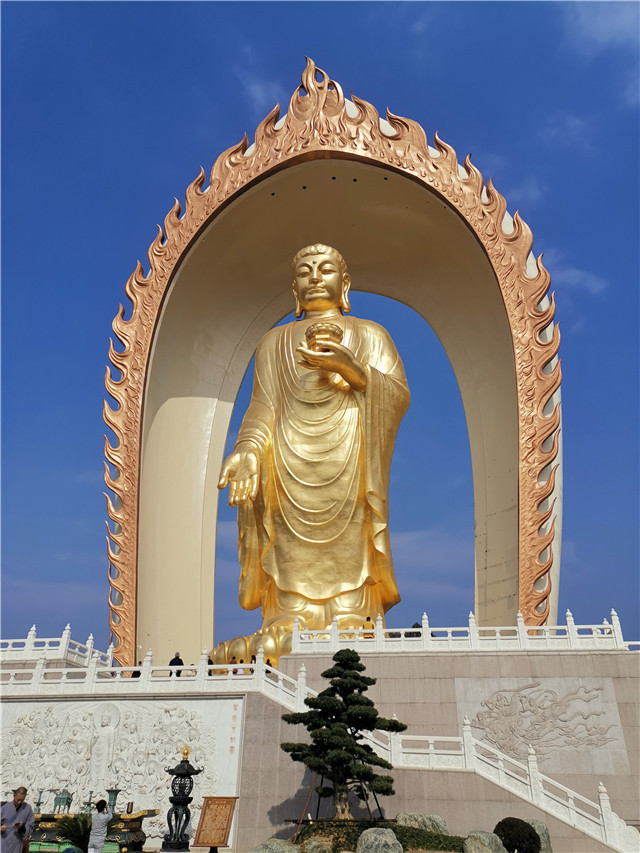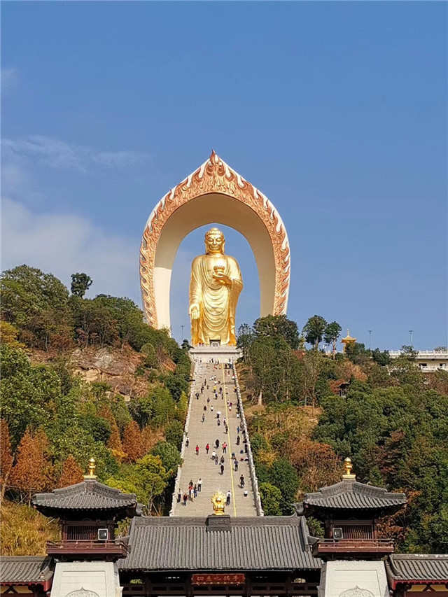 金秋的陽光溫馨恬靜,金秋的微風(fēng)和煦輕柔,金秋的藍(lán)天白云飄逸,金秋的田野遍地金黃。團(tuán)建第三天,我們來到了九江星子縣瞻仰世界最高48米大佛--東林大佛。經(jīng)了解,大佛北依廬山主峰,群山環(huán)抱,山水相連,彌陀壇城,凈宗道場(chǎng),朝圣勝地,是一方集朝圣、修行、弘法、教育、慈善為一體的凈土。高度48米,以表阿彌陀佛發(fā)的四十八大愿。總高81米,為至火焰寶蓋頂點(diǎn)之距,81米,以表九九八十一,意為修行成佛艱辛不易。在阿彌陀佛像里面,是中國及全球第一高的。我們帶著無比虔誠的心瞻仰著。此刻的心靈,猶如明鏡一般清澈、透明,遠(yuǎn)離塵囂!