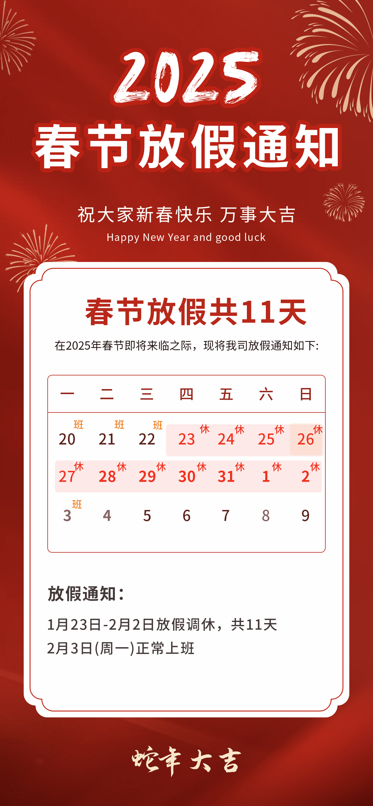 正值中國的傳統(tǒng)節(jié)日"春節(jié)"來臨,在此向各位新老客戶和廣大朋友們拜個早年!預祝大家新春愉快!財源廣進!事業(yè)紅火!為了讓公司員工過一個歡樂祥和的春節(jié),將對春節(jié)假日提前和延長,現(xiàn)將公司春節(jié)放假時間通知如下:2025年1月23日(農(nóng)歷臘月二十四)~2025年2月2日(農(nóng)歷正月初五)(共計11天),2月3日(農(nóng)歷正月初六)正式上班。